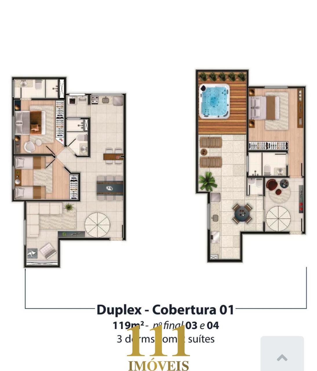 Linda cobertura duplex à venda no Siete Residence em Jacareí. Ideal para quem busca conforto, privacidade e lazer completo em casa. 119m² com 3 dormitórios sendo 2 suítes, sala ampla e arejada, móveis planejados, cobertura duplex com piscina e churrasqueira privativa, 2 vagas de garagem. Condomínio com piscina adulto e infantil, academia equipada, salão de festas, salão de jogos, churrasqueira, vaga para visitantes, 2 elevadores por torre e segurança 24hs. Localização privilegiada, com fácil acesso a comércios, escolas, supermercados e vias principais da cidade. Aproveite essa oportunidade e agende já a sua visita! 111 imóveis Creci 031301-J