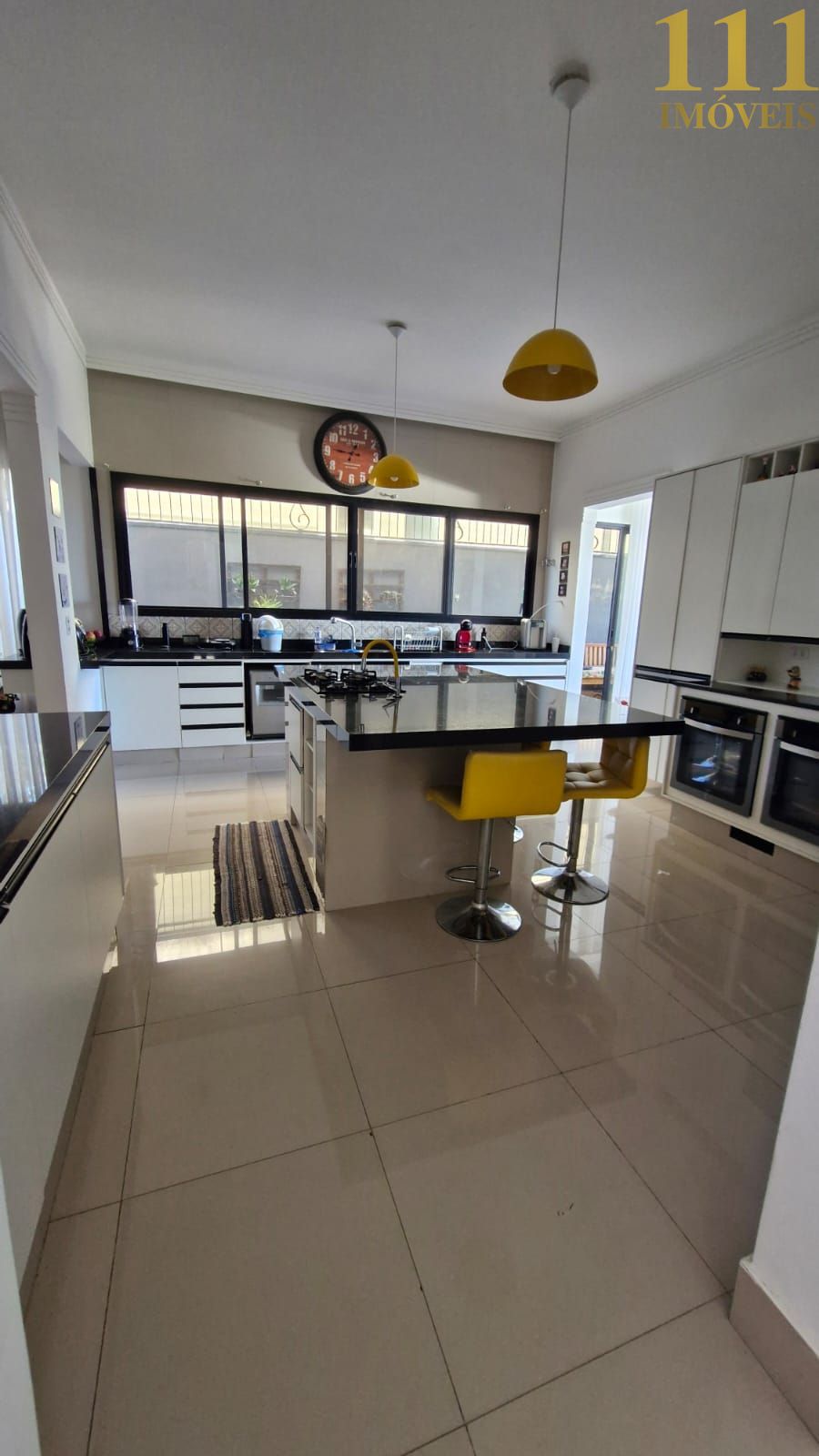 Cozinha repleta de armários, com ilha em granito.