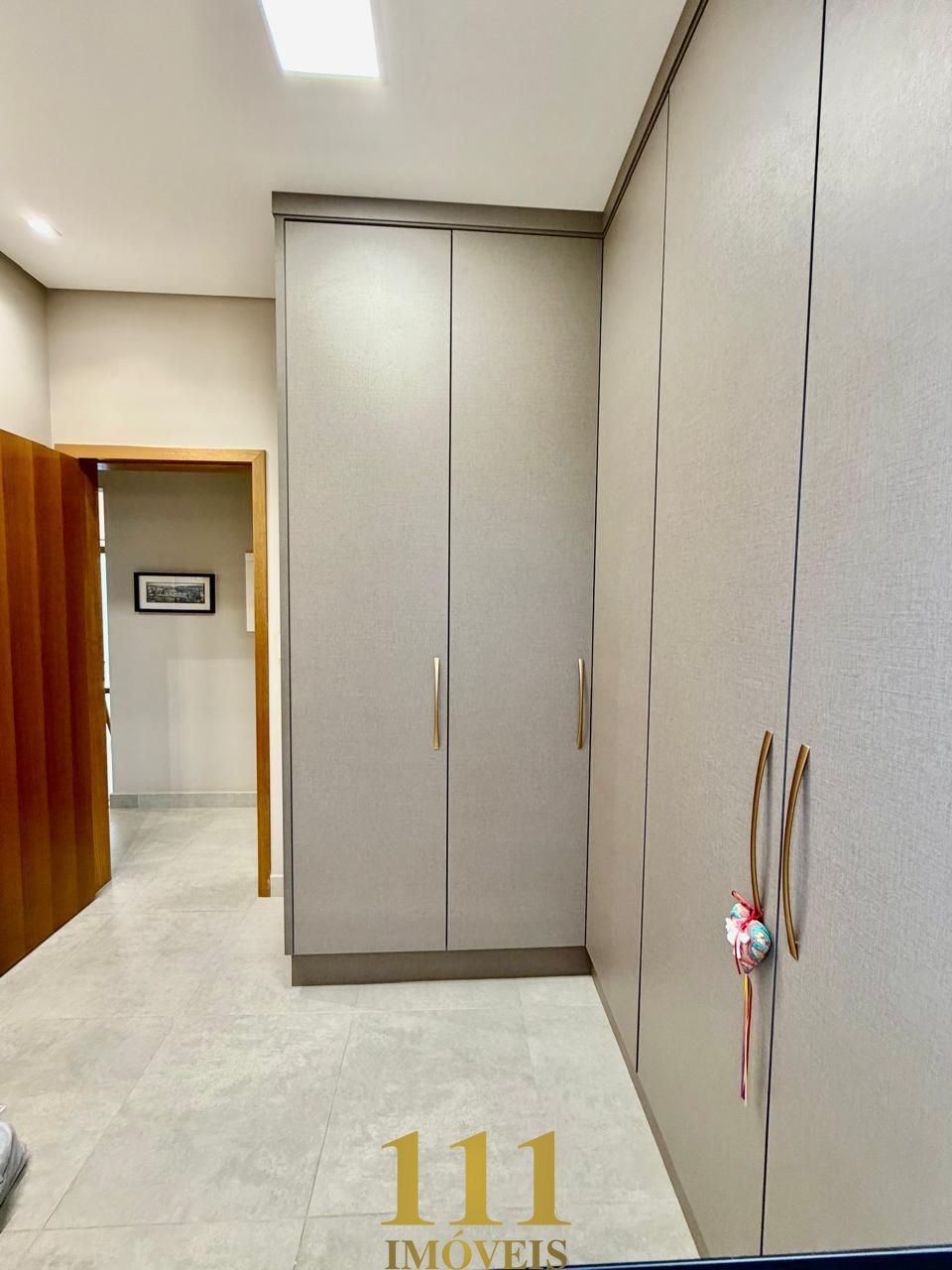 Suíte master com closet, armários sofisticados, iluminação em LED e elegantes portas reflecta