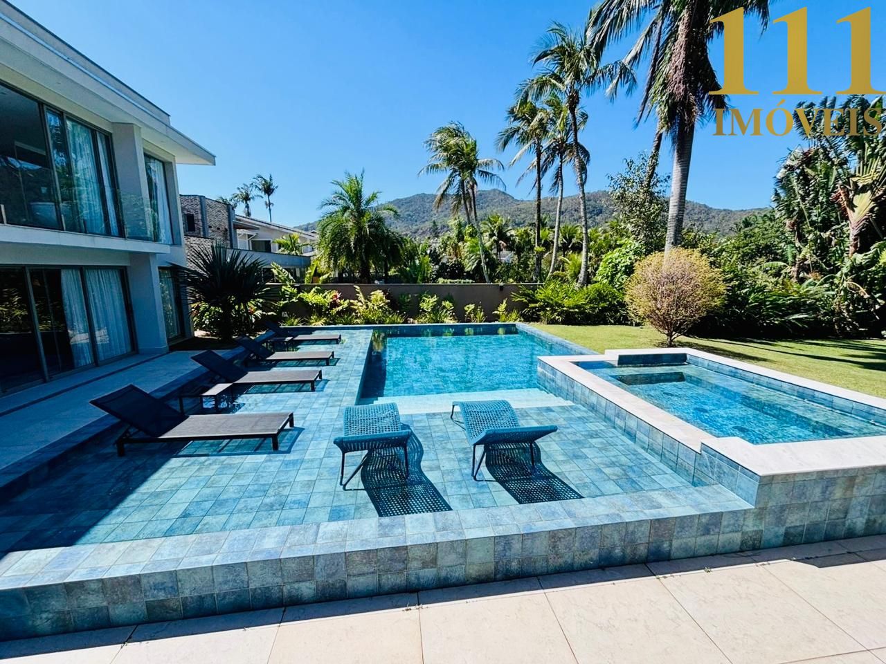 Para o lazer, a mansão dispõe de uma piscina com deck molhado, jacuzzi, ambiente preparado para sauna e uma charmosa lareira para noites mais frescas.