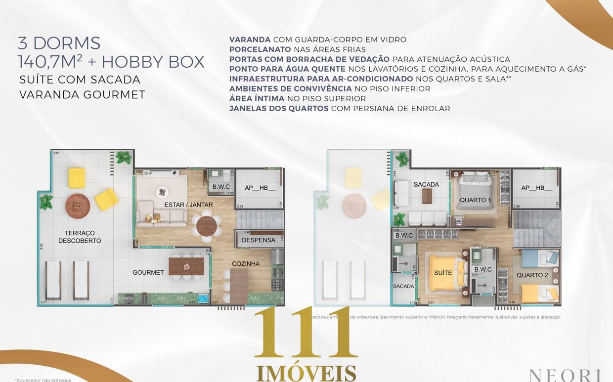 O piso superior conta com área íntima e varanda com guarda-corpo em vidro, ideal para relaxamento. O acabamento inclui porcelanato nas áreas frias e portas com vedação acústica. A cobertura oferece pontos de água quente para lavatórios e cozinha, com aquecimento a gás, além de infraestrutura para ar-condicionado nos quartos e na sala. As janelas dos quartos são equipadas com persianas, e o imóvel conta com hobby box no mesmo andar para maior praticidade. Ideal para quem busca conforto e exclusividade.